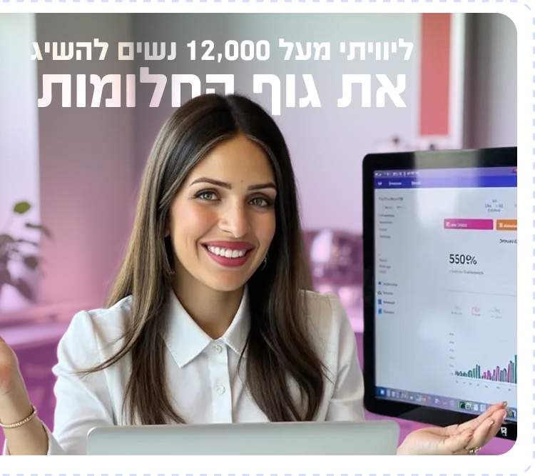 קבוצת פרימיום עם מנטורית מקצועית, סדנאות חודשיות, תוכן חדש כל הזמן, וקהילה של נשים שעוברות את זה איתך. אף פעם לא לבד, אף פעם בלי תמיכה.