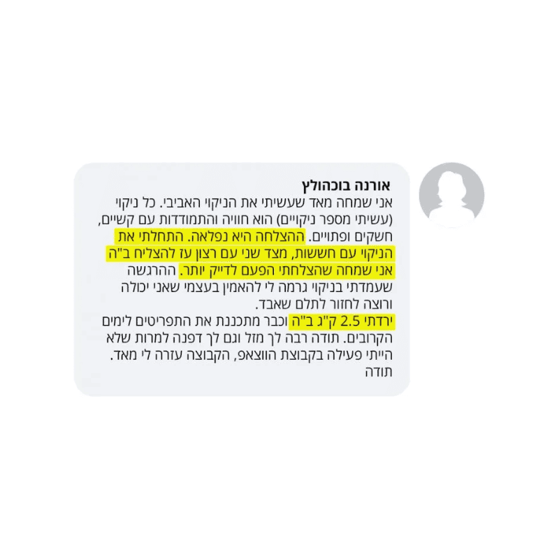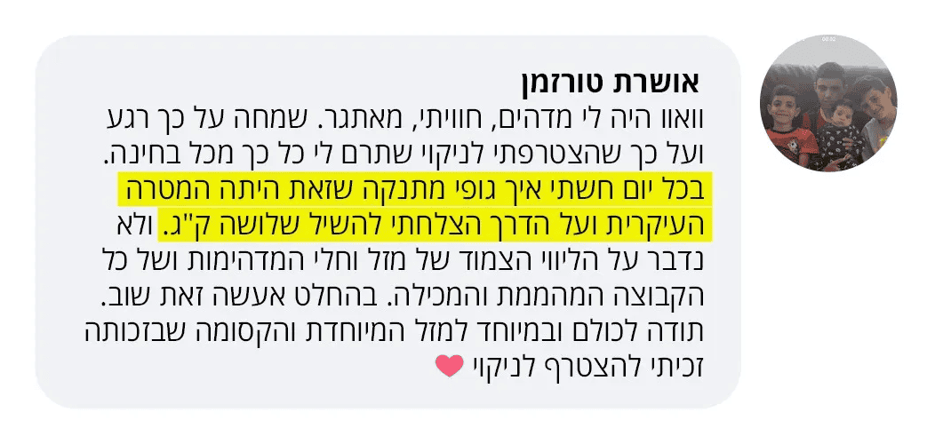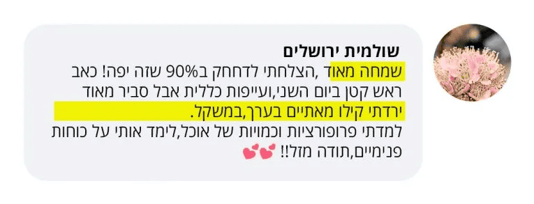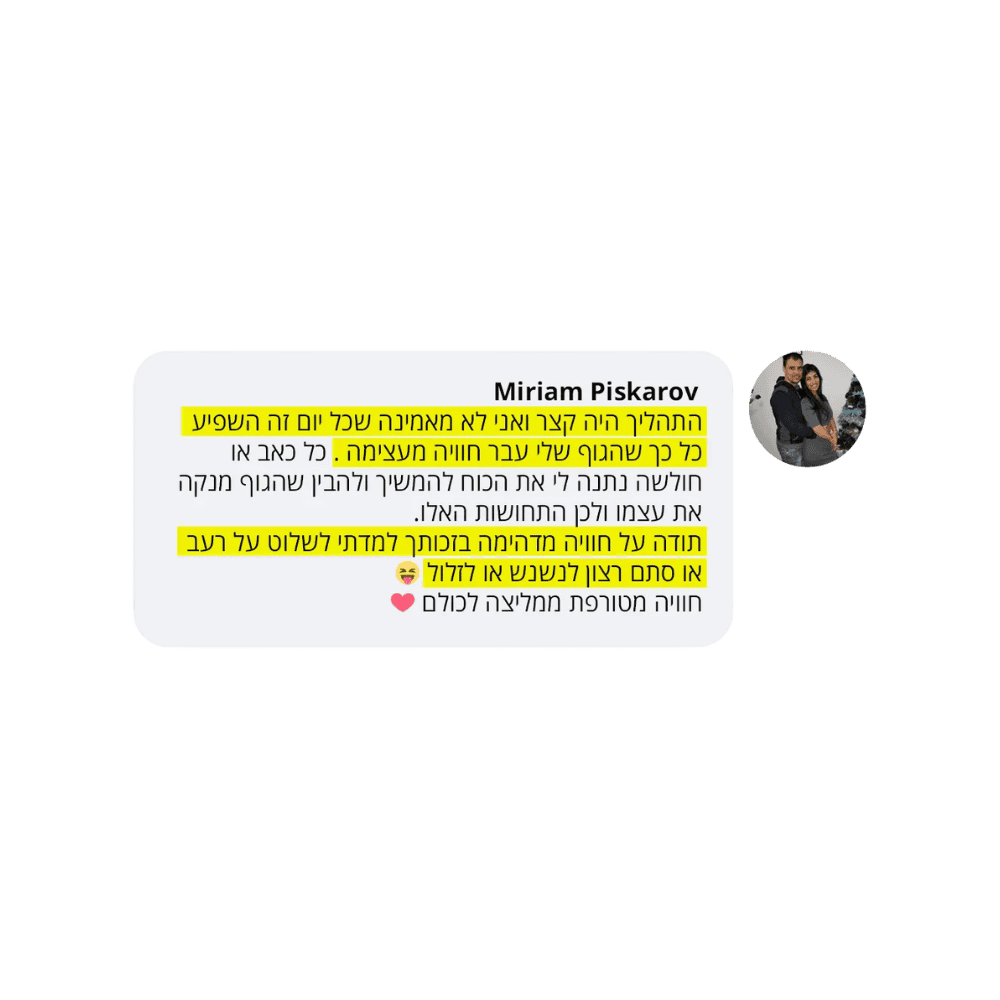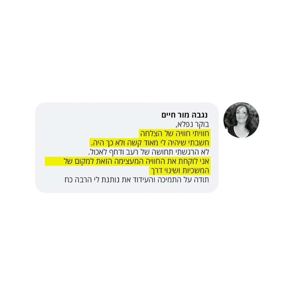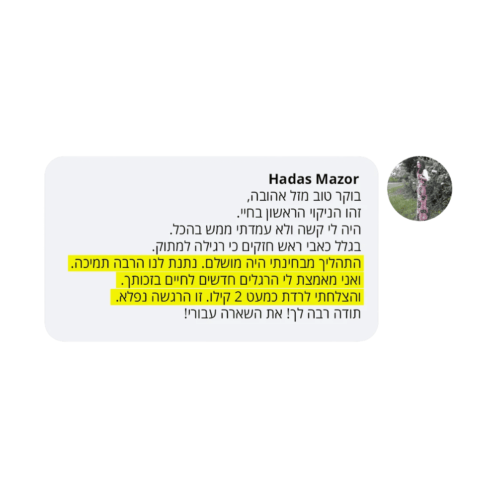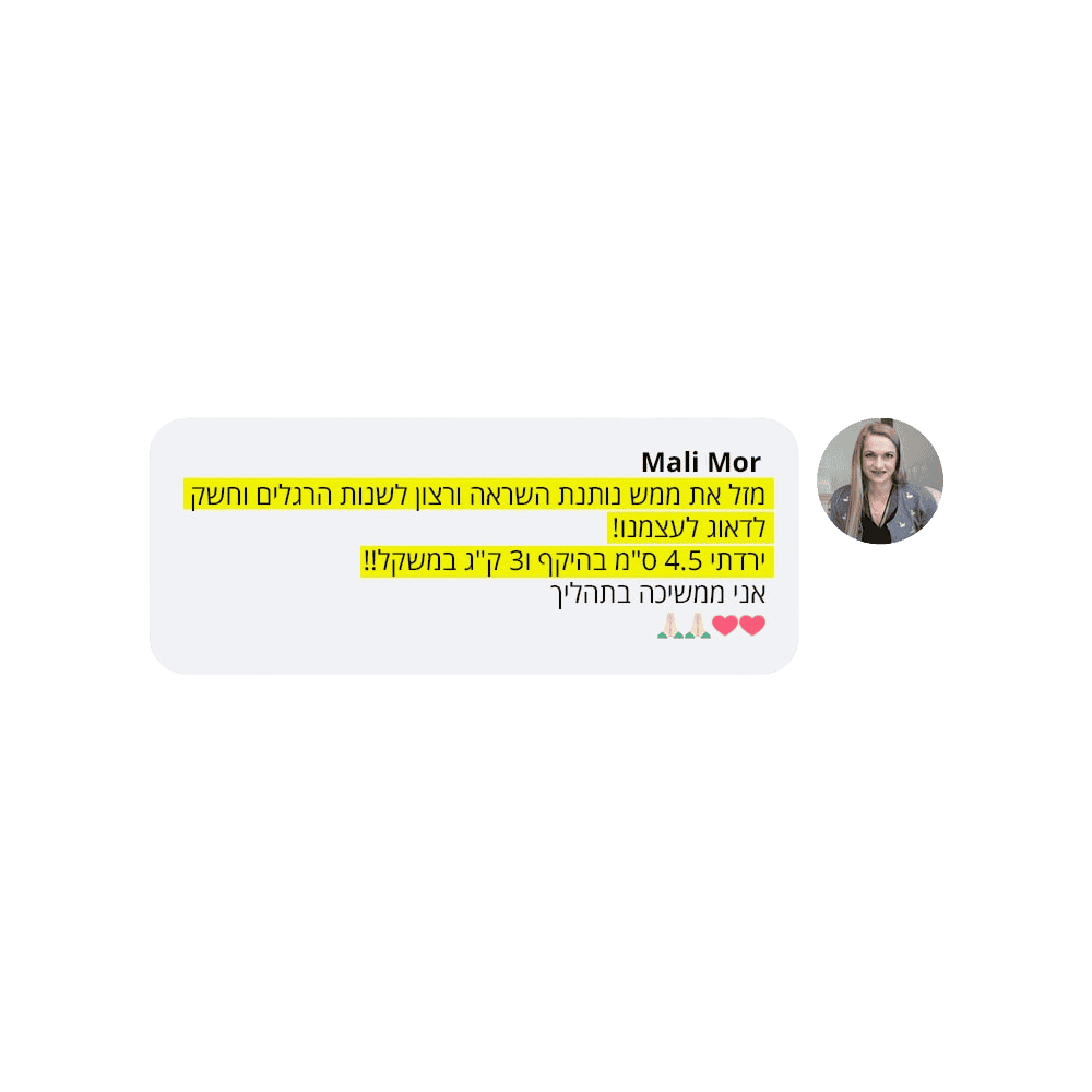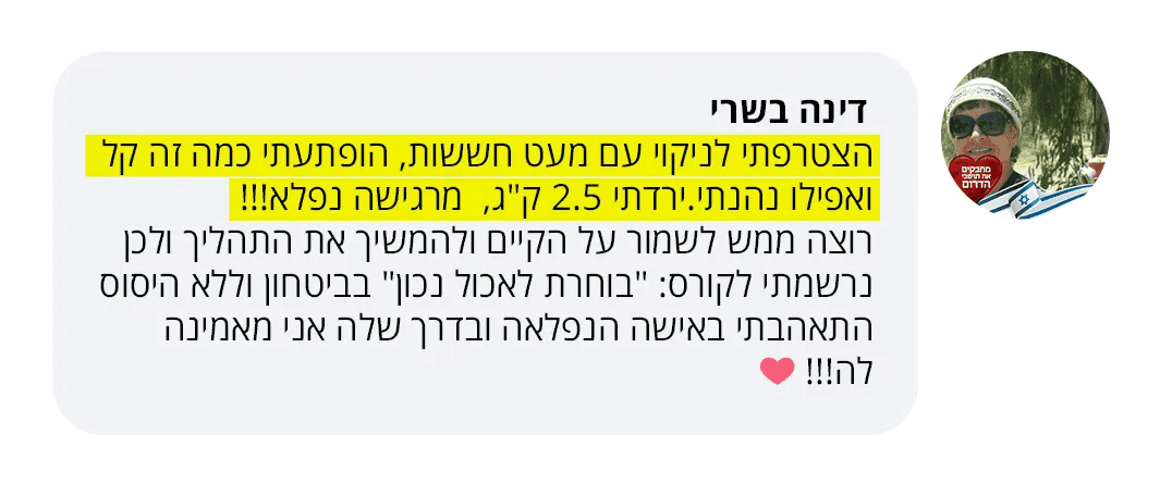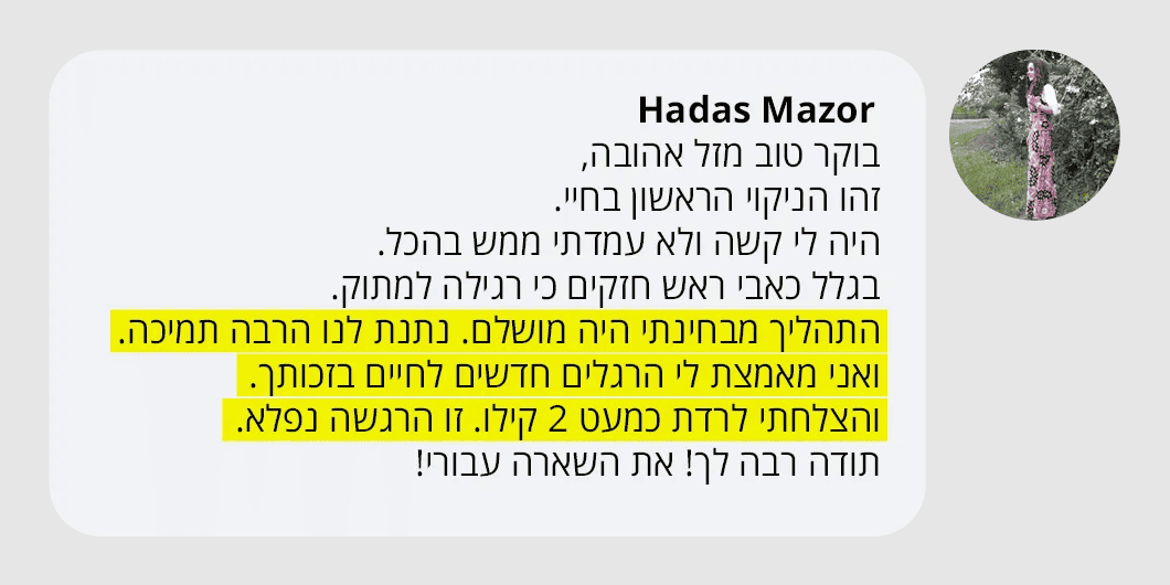 בעקבות ההצלחה הענקית שחוויתי בתהליך שלי, החלטתי לפתוח קבוצת פייסבוק ולעזור לעוד נשים, הנשים הללו חוו פריצות דרך שאפילו אני הופתעתי ואז הבנתי שיש כאן בשורה מצילת חיים לנשים, וזו השליחות שלי בשבילך.
