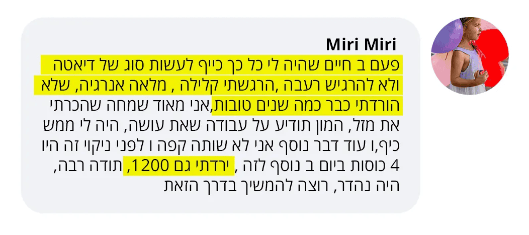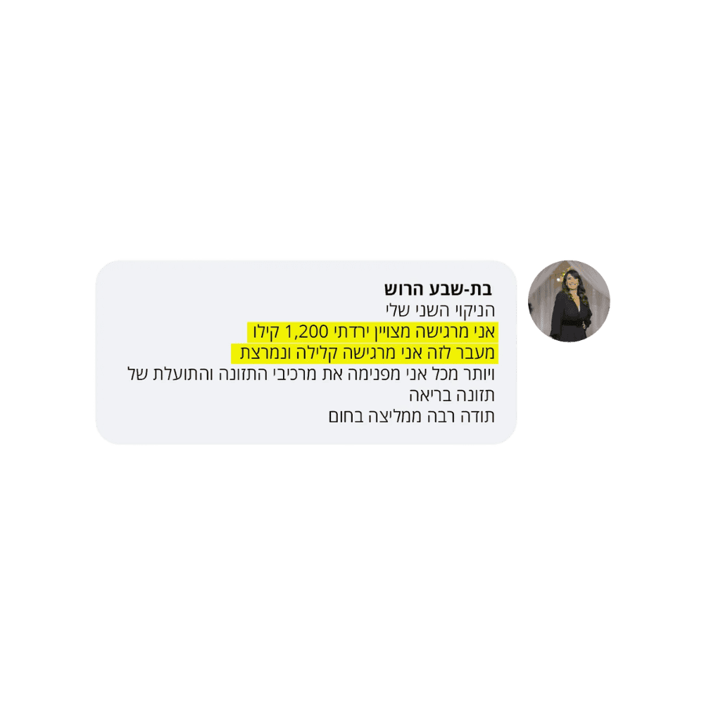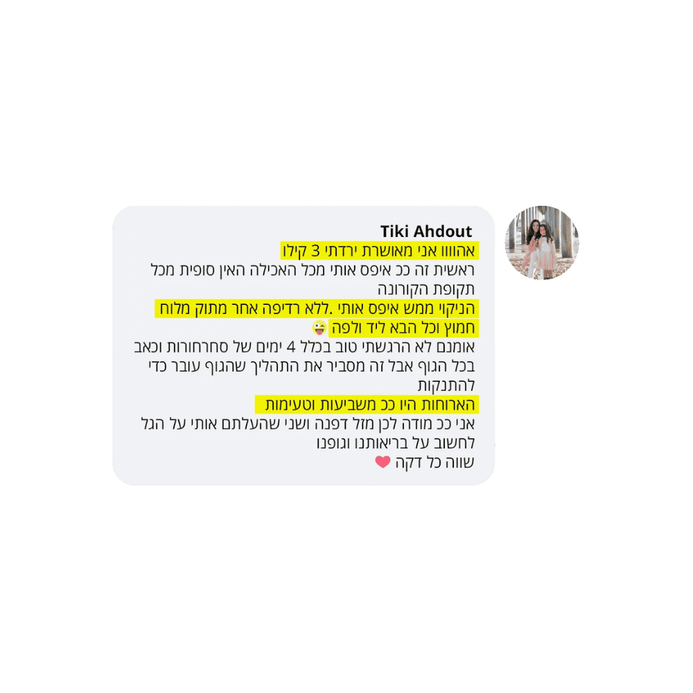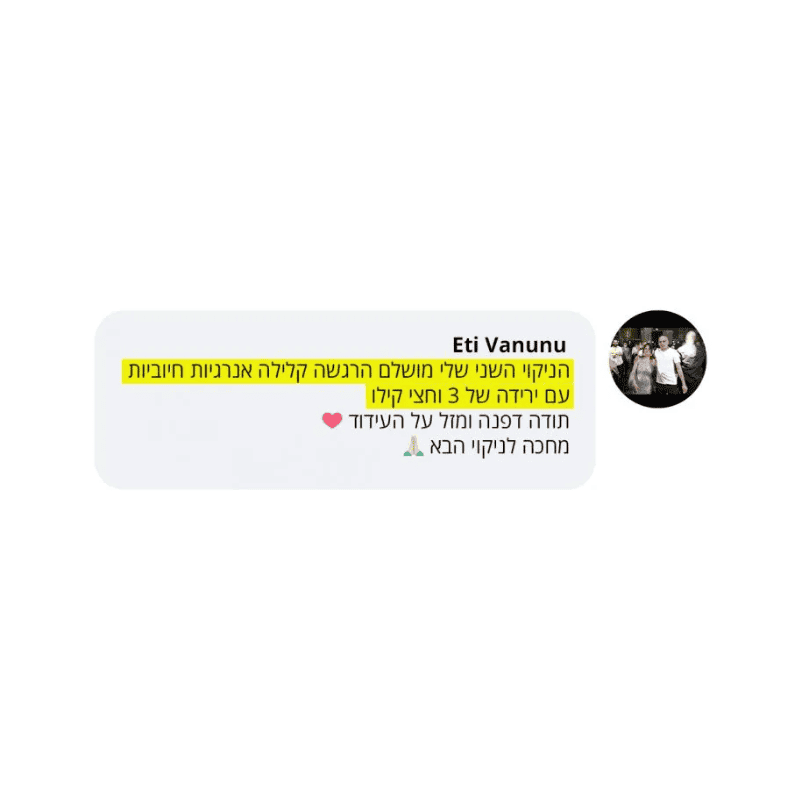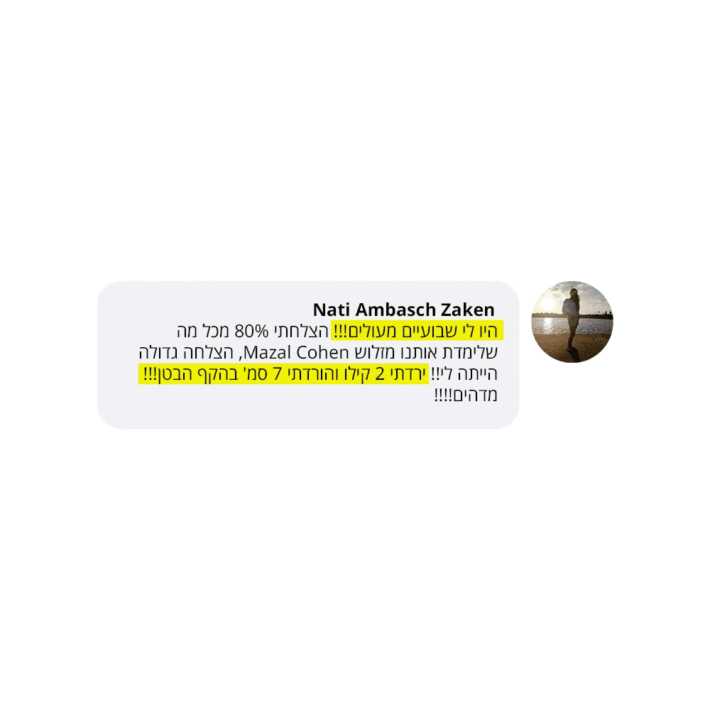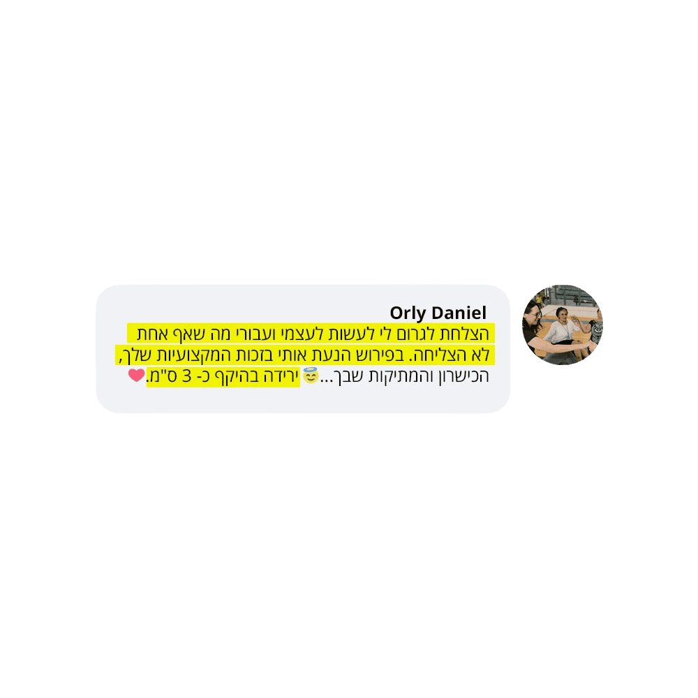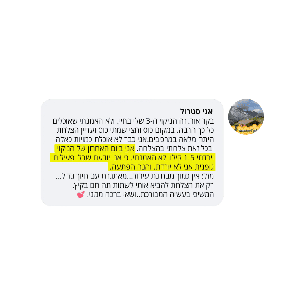 בעקבות ההצלחה הענקית שחוויתי בתהליך שלי, החלטתי לפתוח קבוצת פייסבוק ולעזור לעוד נשים, הנשים הללו חוו פריצות דרך שאפילו אני הופתעתי ואז הבנתי שיש כאן בשורה מצילת חיים לנשים, וזו השליחות שלי בשבילך.