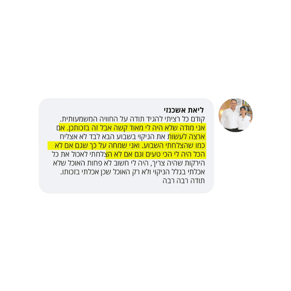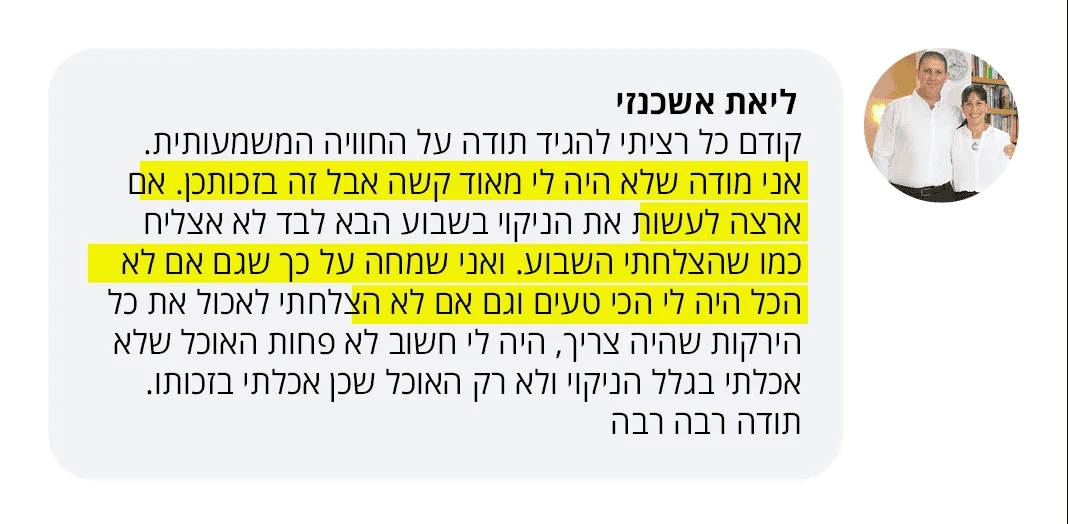 זה חשש שהוא כל כך ברור ומובן. התאמצנו והשגנו תוצאה, אנחנו לא רוצות לאבד אותה ובדיוק בגלל זה ביום השלישי של הניקוי אני מקיימת הדרכה פרקטית עם צעדים ברורים מה עושים הלאה, איך משמרים את תוצאות הניקוי. ויותר מזה – איך ממשיכים להתקדם לעבר בריאות ומשקל מאוזן.
