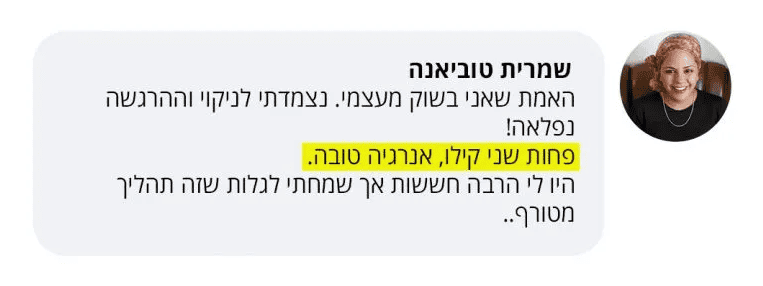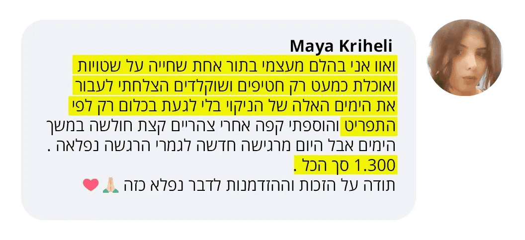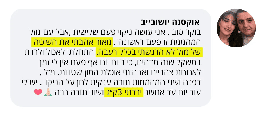 את עטופה מתחילת הניקוי ועד סופו! זה בסכ”ה 4 ימים שלא תאמיני, אבל כולן רוצות להמשיך לעוד כמה ימים מרוב שזה מתגמל ומביא תוצאות מהירות.