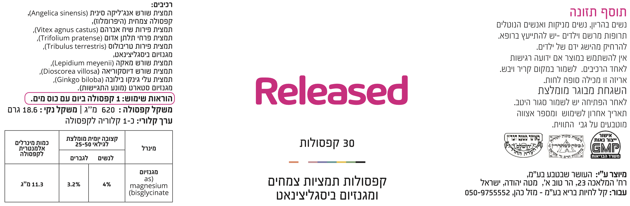 בפורמולת Released יש את כל התמציות והחומרים שגורמים להקלה על גלי חום והזעות לילה, לאיזון הורמונלי טבעי, לשיפור מצב הרוח והאנרגיה ולשיפור איכות השינה.