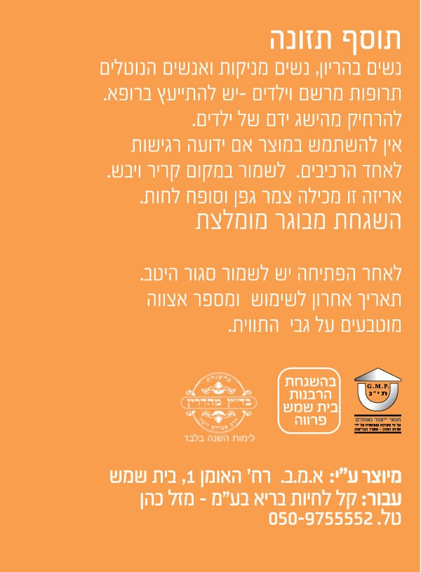 התוסף שלנו מיוצר בישראל, ייצור כחול-לבן, באישור משרד הבריאות, מיוצר תחת בקרה של מערכת ניהול איכות משולבת העונה לדרישות: GMP, lso22000, haccp.