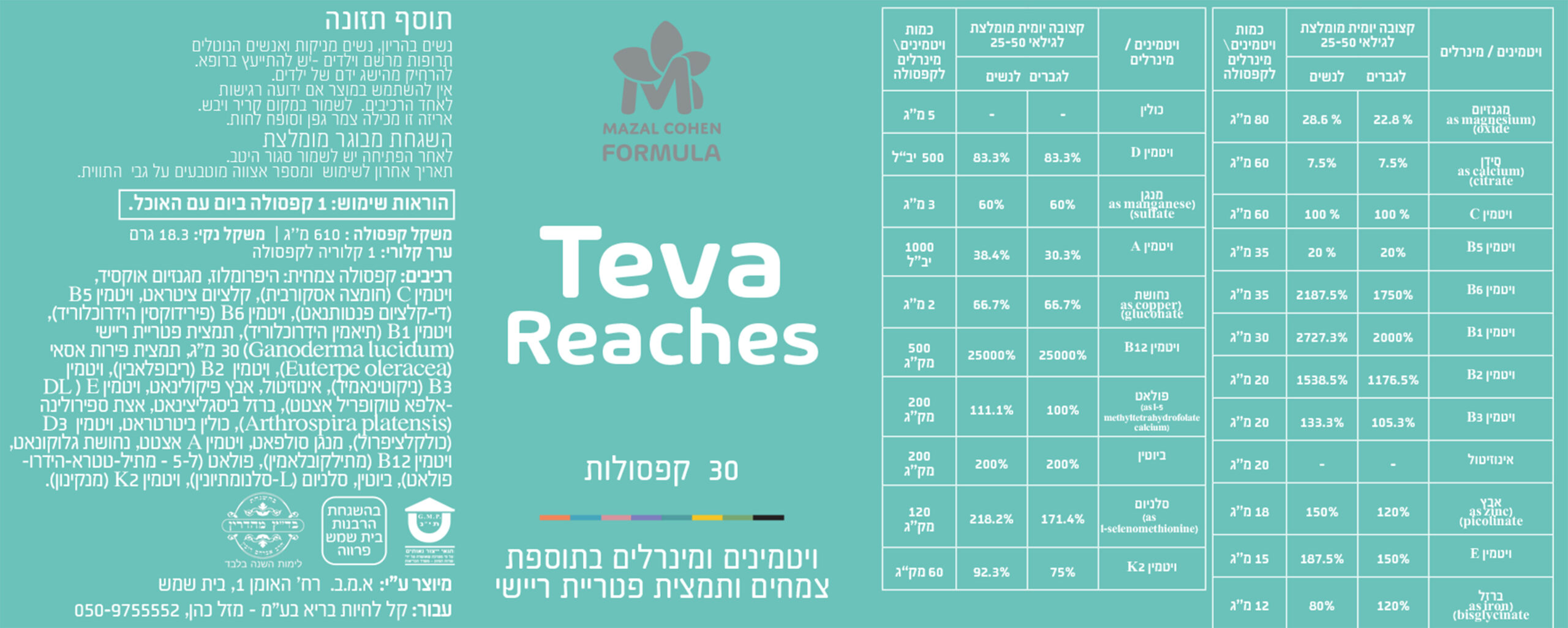 פורמולת Teva Reaches מיוצרת בישראל תחת תקני איכות ובקרה מחמירים, עם אישור משרד הבריאות — כדי שתוכלי להיות שקטה ובטוחה שאת מזינה את הגוף שלך בטוב ביותר.